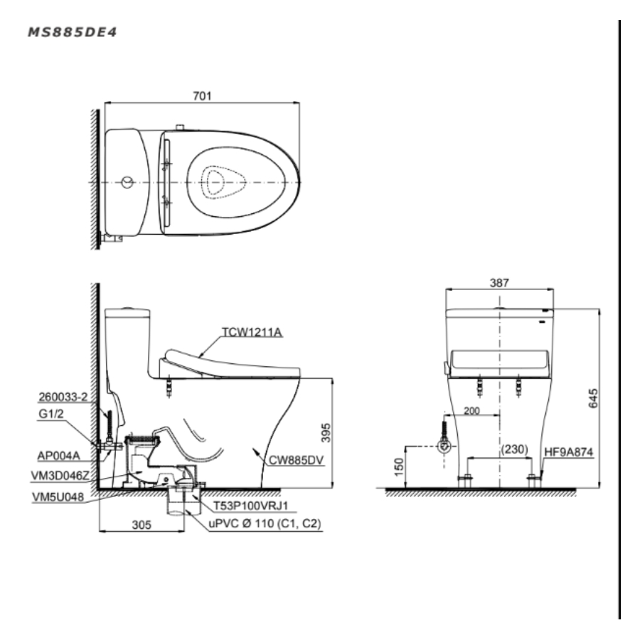 Bản vẽ Bồn Cầu TOTO MS885DE4 Một Khối Nắp Rửa Cơ TCW1211A