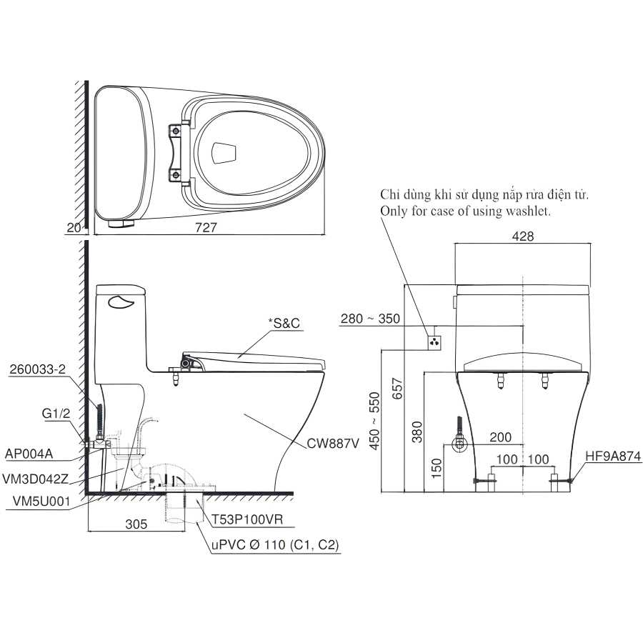 Bản vẽ kích thước bồn cầu MS887CR TOTO nắp điện tử TCF23410AAA W17