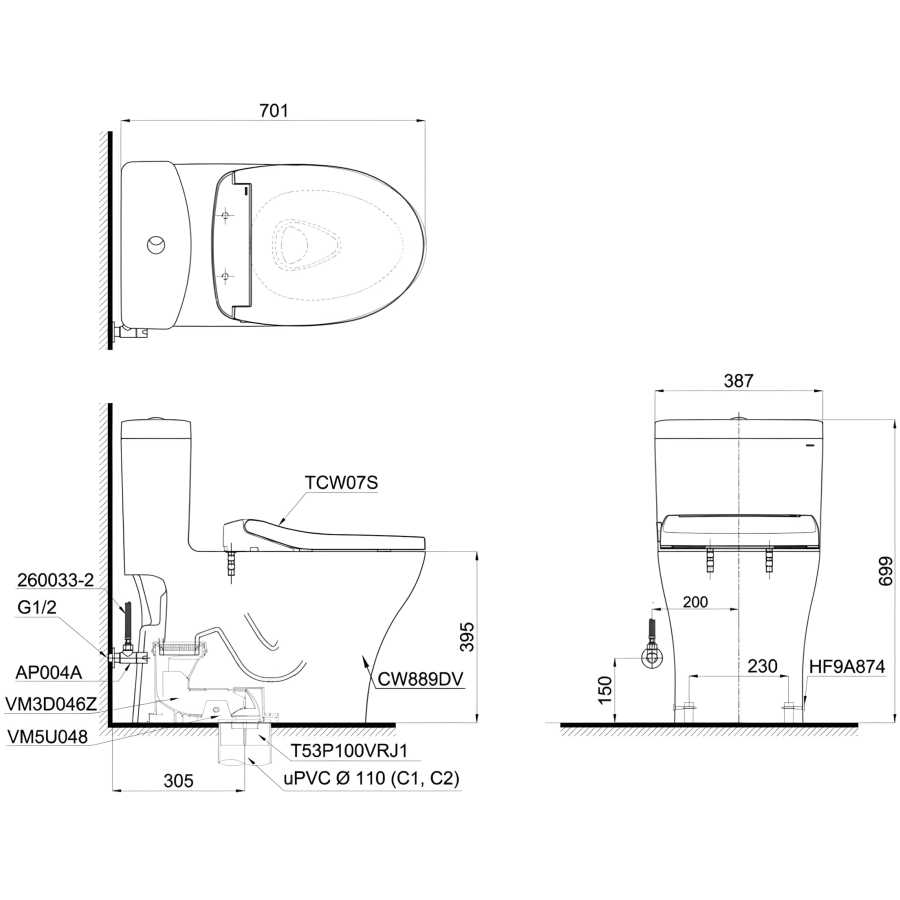 Bản vẽ bồn cầu Ecowasher Toto MS889DRE2 1 khối nắp rửa cơ TCW07S