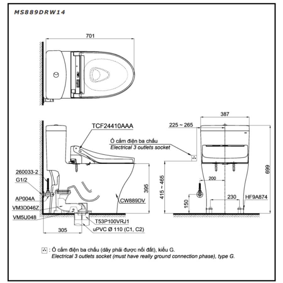 Cấu thành: Thân cầu C889DR (Việt Nam), Nắp rửa điện tử TCF24410AAA (W14) (Malaysia).
