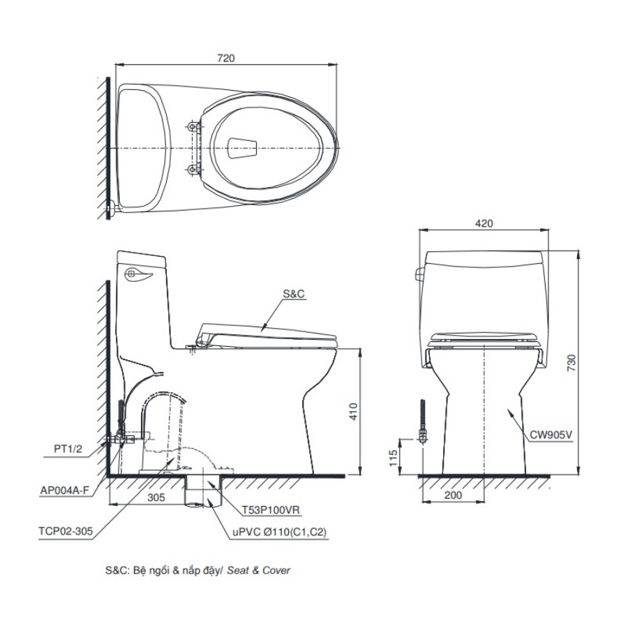Bản vẽ Bồn Cầu TOTO MS905T8 Một Khối Nắp TC600VS (CLC)