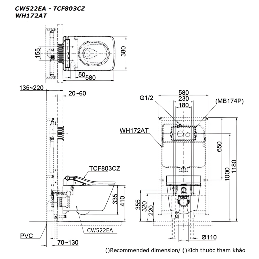 Bản vẽ Bồn cầu treo tường điện tử CW522EA/TCF803CZ/WH172AT/MB171M#SS