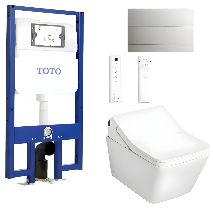 Bộ sản phẩm đồng bộ, tiện lợi: Bao gồm thân cầu CW522EA, nắp rửa điện tử TCF797C2Z, két nước âm tường WH172AAT và nắp đậy nút nhấn MB171M#SS, tạo thành một giải pháp hoàn chỉnh cho phòng tắm hiện đại.