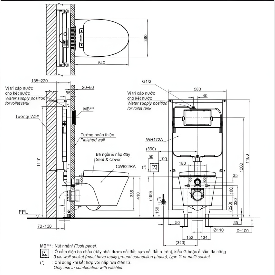Bản vẻ Bồn Cầu Treo Tường TOTO CW822RA/TCF4911Z/WH172A/MB170P#SS Nắp Điện Tử