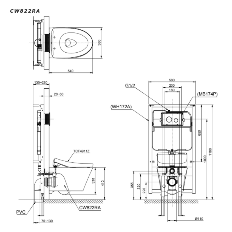 Bản vẽ Bồn Cầu Treo Tường TOTO CW822RA/TCF4911Z/WH172A/MB174P#SS Nắp Điện Tử