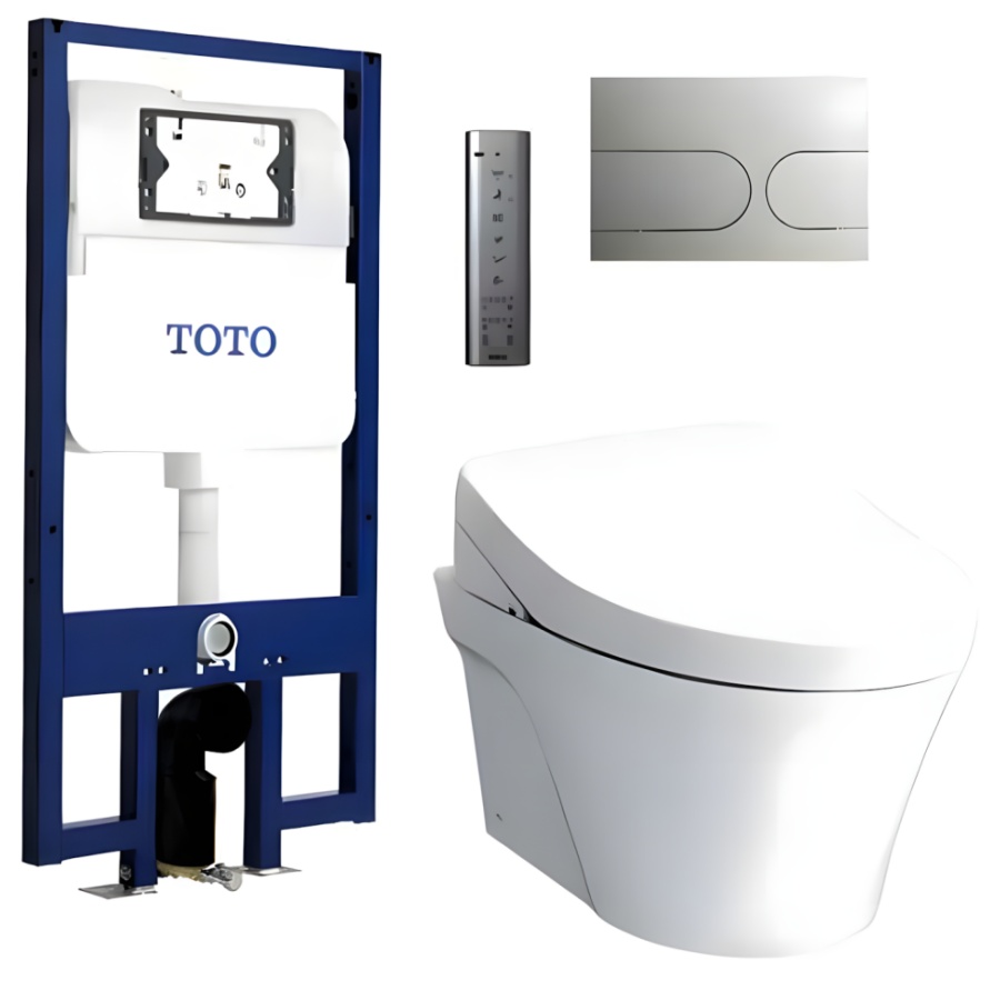 Bồn cầu treo tường TOTO CW822REA tích hợp Washlet C5 TCF24460AAA, két âm WH172AT, khung TCA465, nắp xả MB175M#SS hiện đại và tiện nghi.