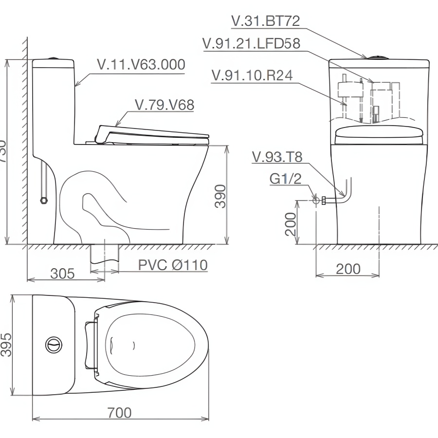 Thiết kế 1 khối độc đáo: Bồn cầu Viglacera V63 có kiểu dáng két liền một khối đặc biệt, mang lại vẻ ngoài hiện đại và sang trọng. Thiết kế thân kín giúp che giấu các đường ống, tạo sự gọn gàng và dễ dàng vệ sinh.