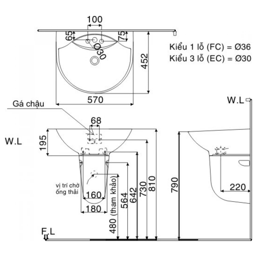 L-288VEC: Chậu có 3 lỗ gắn vòi, phù hợp với nhiều loại vòi chậu rửa phổ biến trên thị trường.