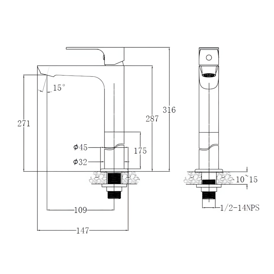 Kích thước: Chiều cao vòi H: 271 mm, Chiều dài vòi L: 109 mm, Chiều cao đầu vòi H1: 316 mm