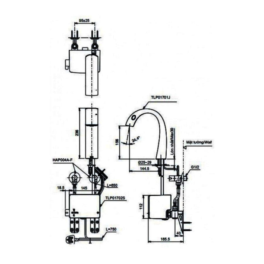 Bản vẽ kỹ thuật vòi chậu cảm ứng nhiệt Matsu TOTO TLP01701J