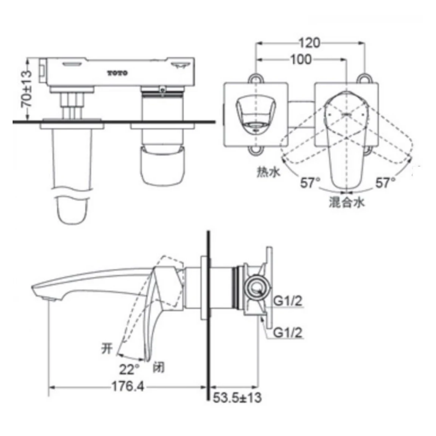 Bản vẽ Vòi Lavabo Gắn Tường TOTO TLG09307BB(TLG09307B) Nóng Lạnh 2 chế độ