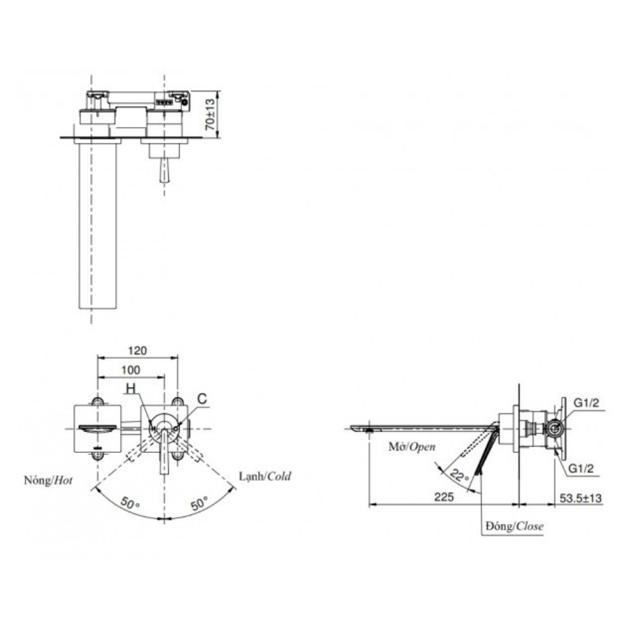 Kích thước vòi (từ tâm xả nước đến tường): 225 mm