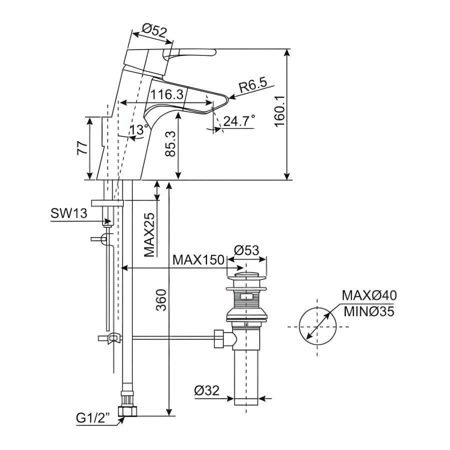 Bản vẽ Vòi Lavabo Nóng Lạnh American Standard Active WF-3907 (WF3907)