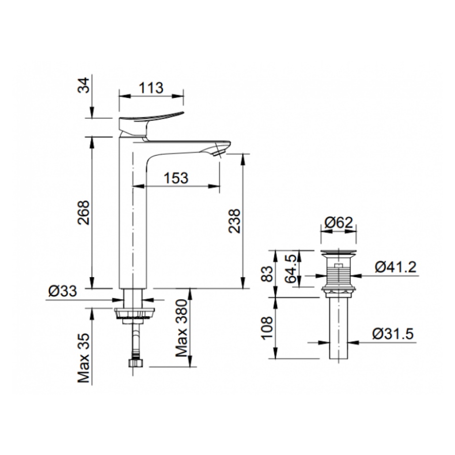 Lưu ý: Bao gồm trụ xả, không bao gồm ống thải chữ P.