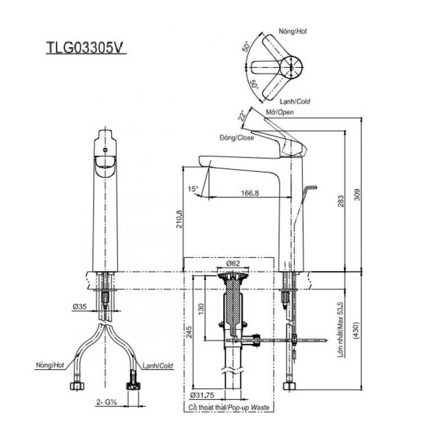 Bản vẽ Vòi Lavabo Nóng Lạnh TOTO TLG03305V Cổ Cao 2 chế độ