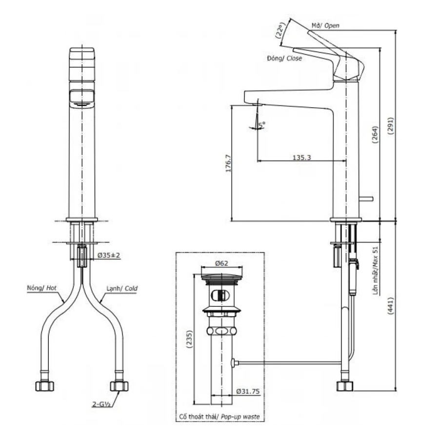 Loại vòi: Vòi lavabo nóng lạnh, cổ cao