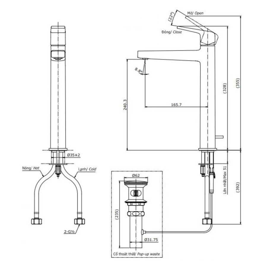 Bản vẽ Vòi Lavabo Nóng Lạnh TOTO TLG10305V Cổ Cao 2 chế độ