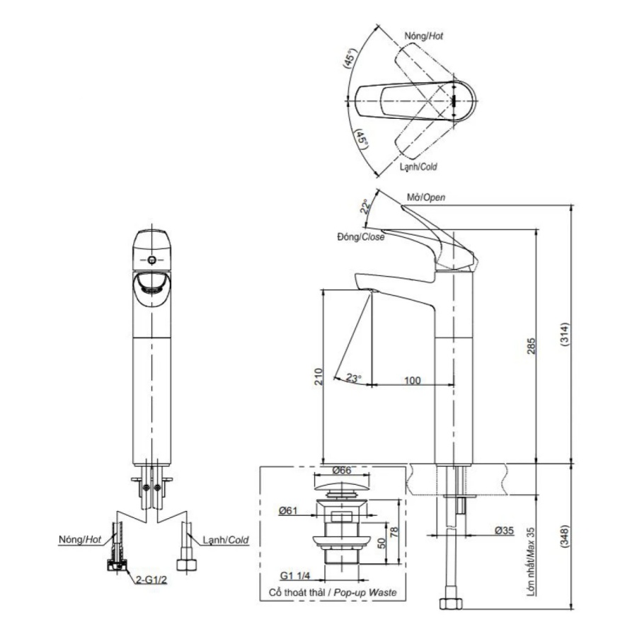 Bản vẽ Vòi Lavabo Nóng Lạnh TOTO TVLM106CR Cổ Cao 2 chế độ