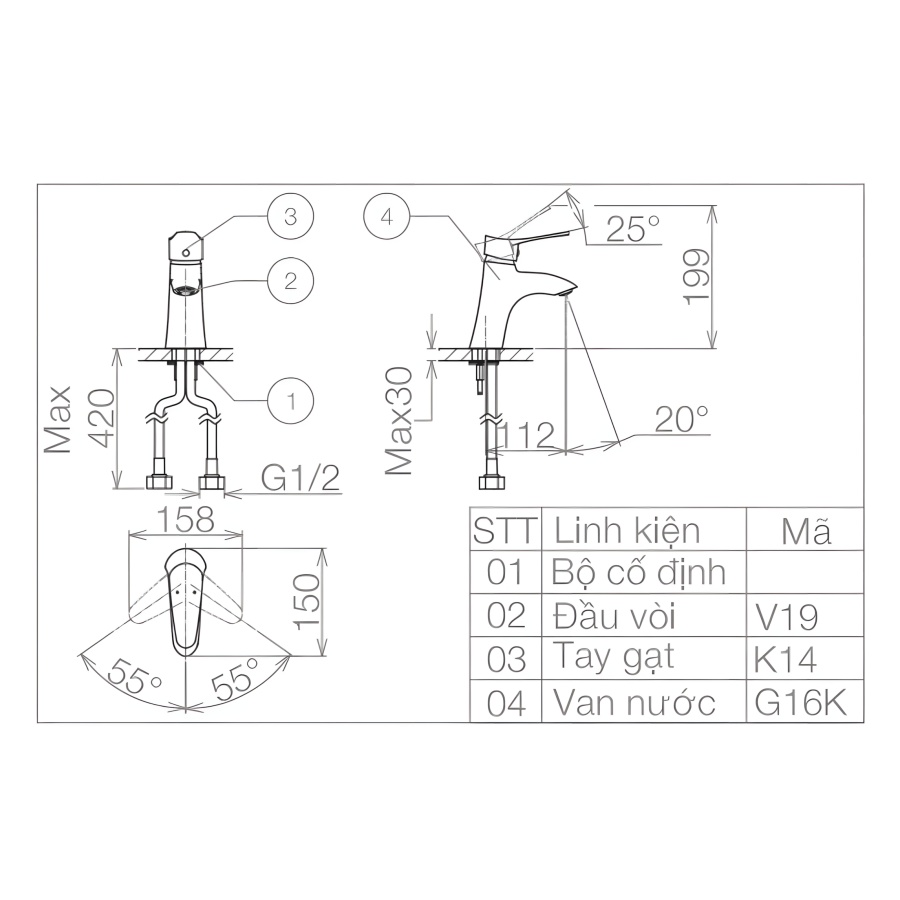 Bản vẽ Vòi Lavabo Nóng Lạnh Viglacera VG114