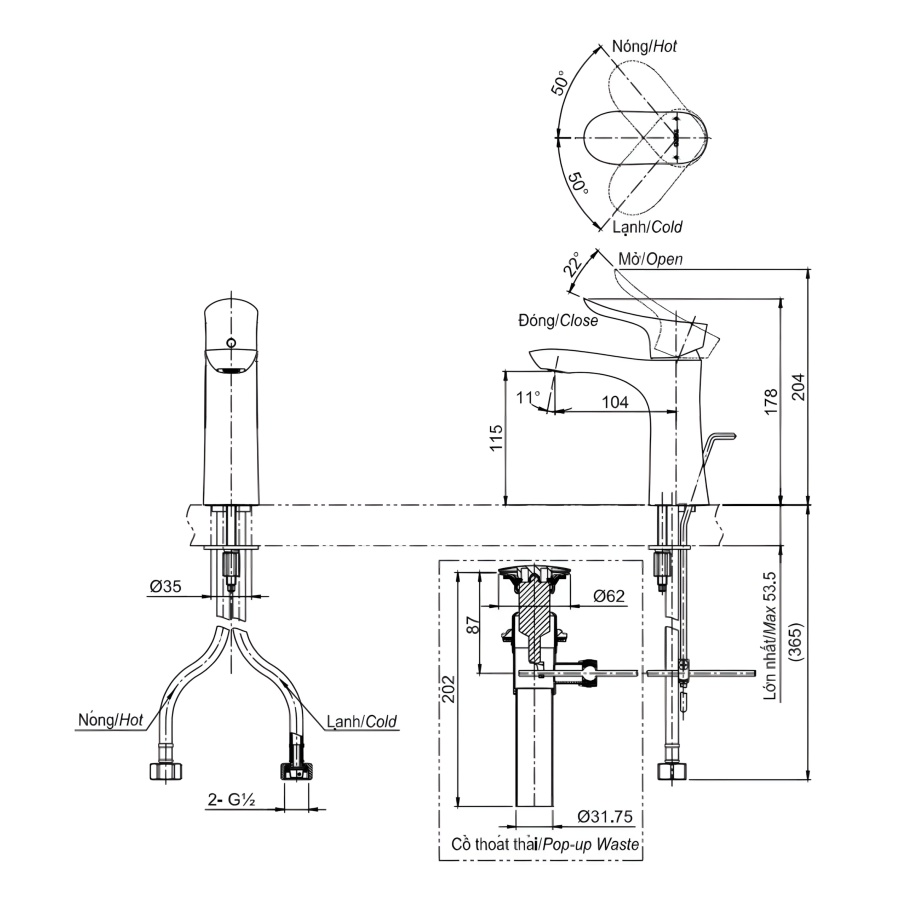 Áp lực nước: 0.05MPa ~ 0.75MPa