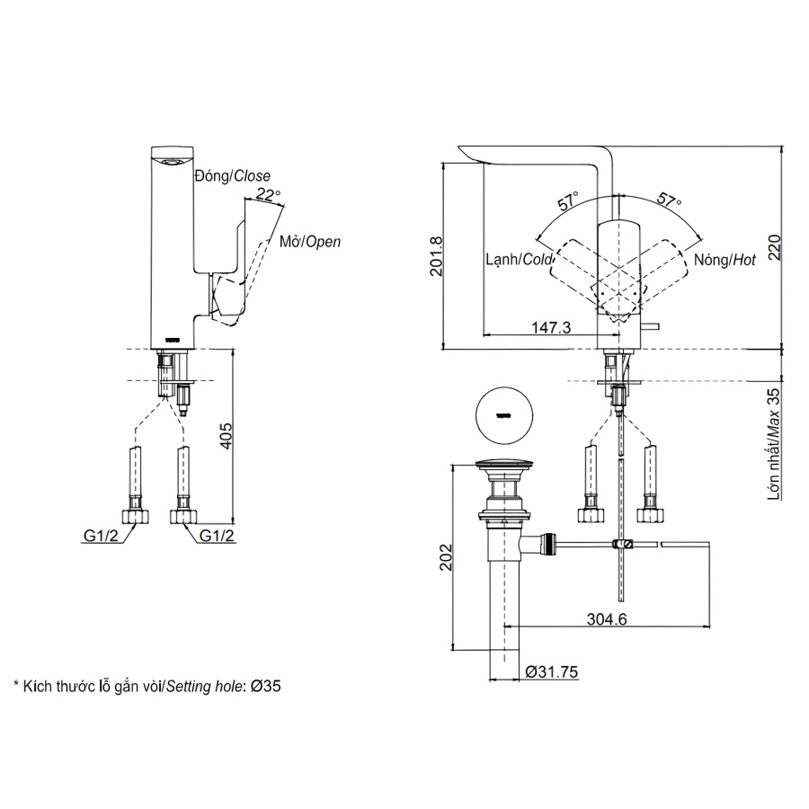 Áp lực nước: 0.05MPa ~ 0.75MPa