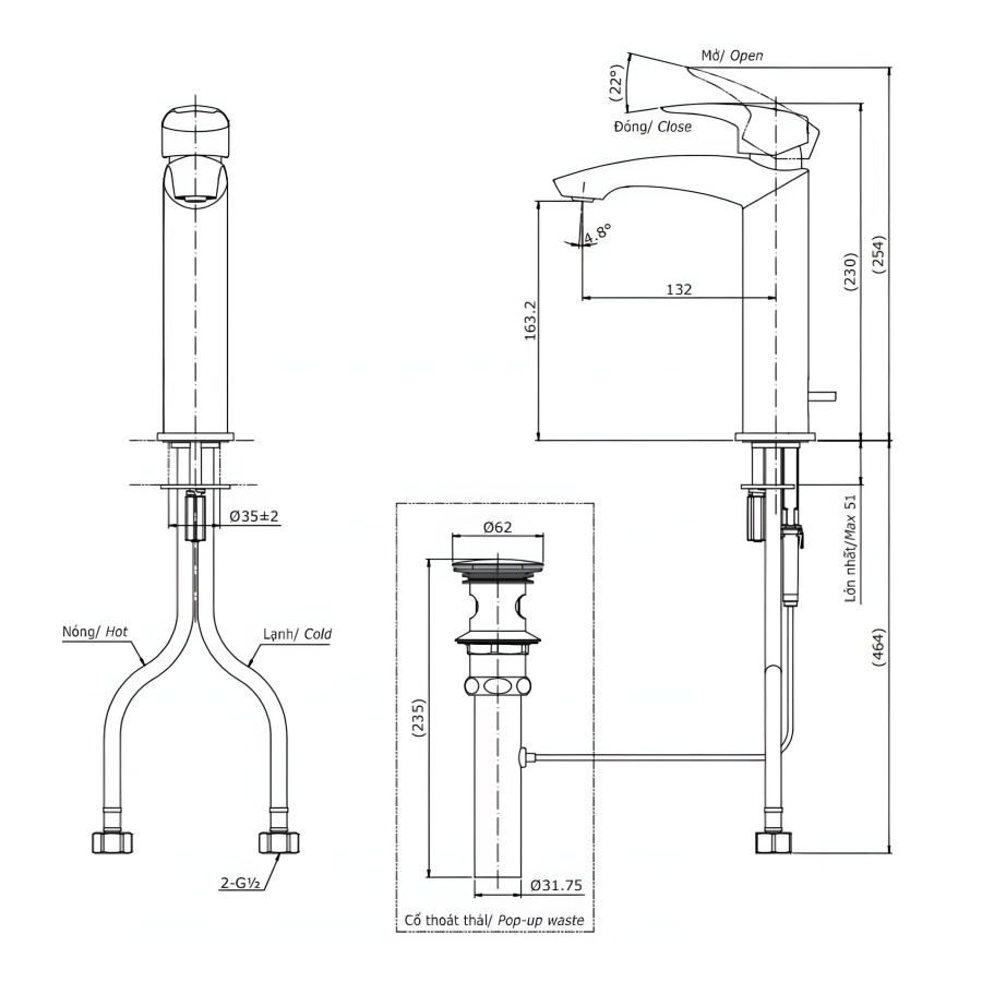 Áp lực nước: 0.05 MPa ~ 0.75 MPa
