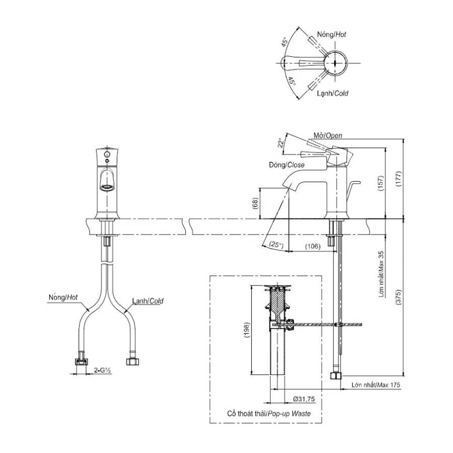 Bản vẽ kích thước Vòi Lavabo TOTO TLS02301V Gật Gù Nóng Lạnh