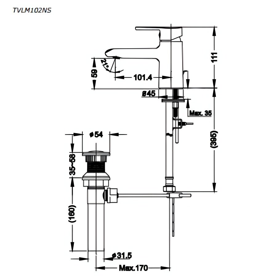 Bản vẽ Vòi Lavabo TOTO TVLM102NSR Nóng Lạnh