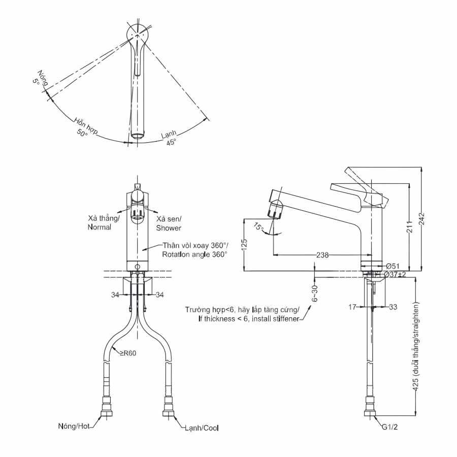 Thiết kế tối giản & Xoay linh hoạt: Thiết kế hiện đại, tinh tế. Vòi có thể xoay 180 độ, tăng tính linh hoạt và phạm vi sử dụng.