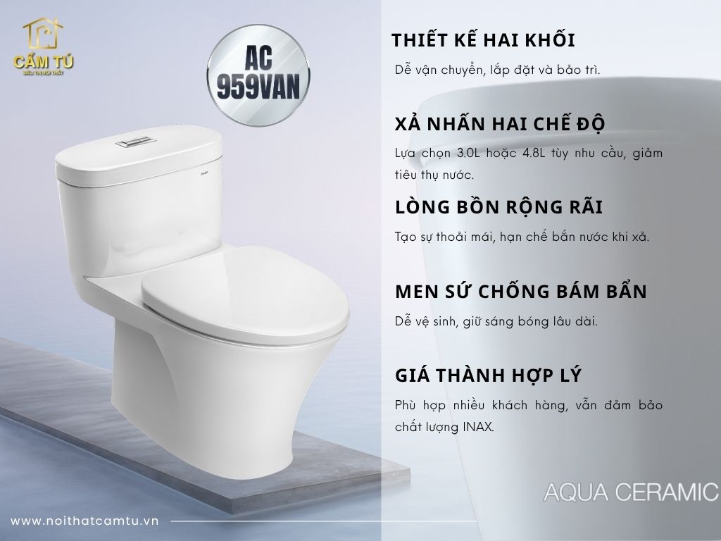 Giá thành hợp lý: So với các mẫu nguyên khối, AC-959VAN có mức giá phải chăng hơn, phù hợp với nhiều đối tượng khách hàng nhưng vẫn đảm bảo chất lượng INAX.