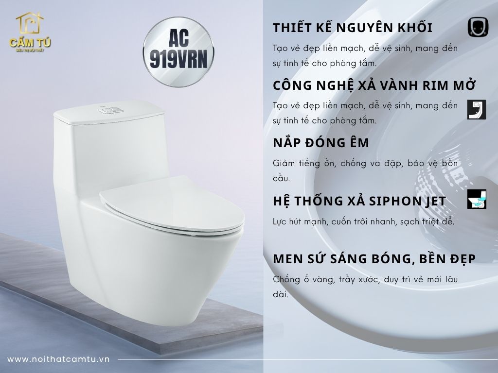 Nắp đóng êm ái, chống va đập: Tương tự như AC-969VN, AC-919VRN cũng được trang bị nắp đóng êm, loại bỏ hoàn toàn tiếng ồn khó chịu, bảo vệ bồn cầu khỏi hư hại do va đập mạnh.
