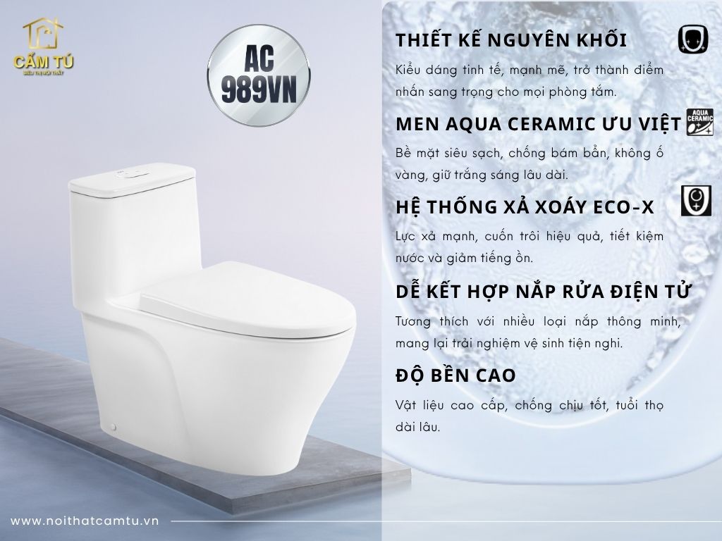 Thiết kế dễ dàng kết hợp nắp rửa điện tử: AC-989VN được thiết kế tối ưu để có thể dễ dàng lắp đặt và kết hợp với các loại nắp rửa điện tử thông minh, mang đến trải nghiệm vệ sinh cá nhân hoàn hảo nhất (tự rửa, sấy khô, sưởi ấm bệ ngồi...).
